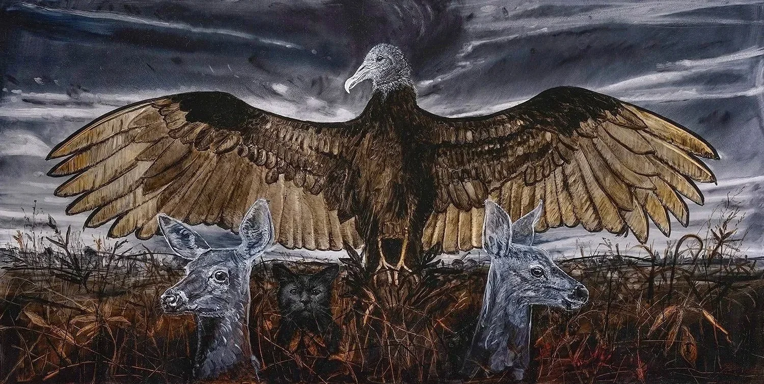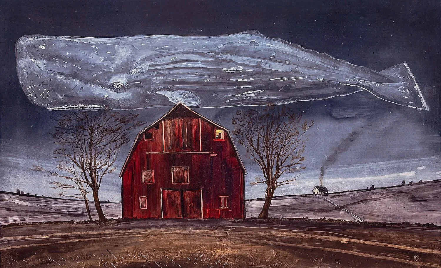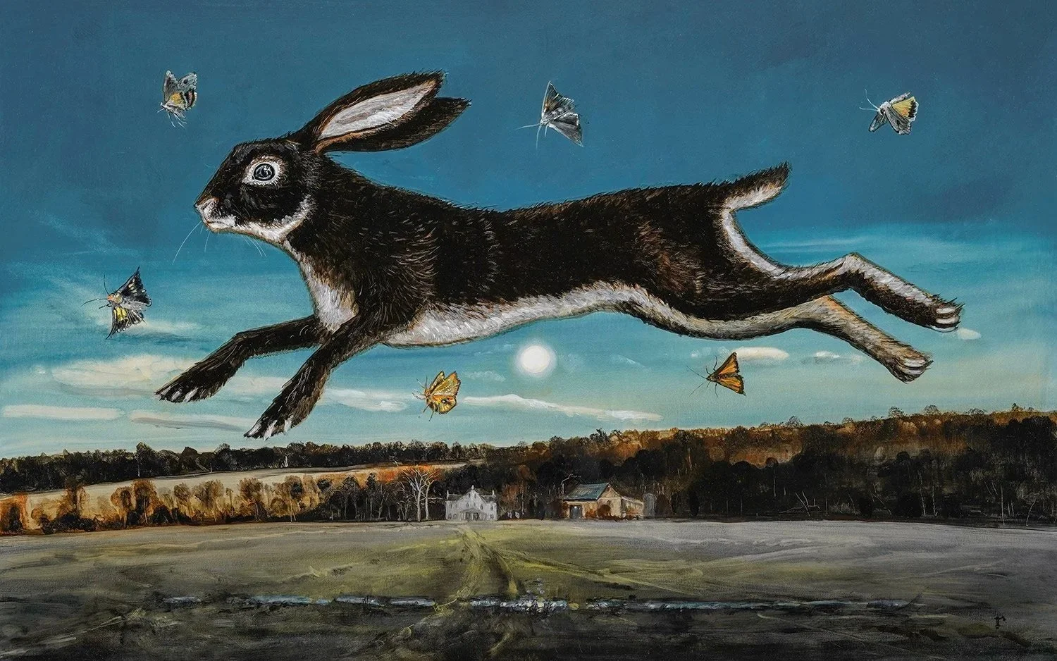 Be it over land or water, Tippett’s vast skies stir the imagination. Hovering in his paintings’ skies are adventure-seeking dogs, ghost-like sperm whales, and other animals mixed with relics of the past – from historical warships to vintage cars. Tippett finds inspiration in literature and history, machines and inventions, pairing the wonder of the natural world with his favorite manmade creations. In these Romanticist-inspired paintings, the smallest figures on the ground – be it a person or an animal – find whales and other larger-than-life elements in their encounter with the sublime. Ultimately, Tippett’s works ask about the passing of time, and the myriad elements that hover between heaven and earth. Is it a ghost? A glorious machine now retired? A dream or memory that lives on? And how is it that when we look up at the night sky they sometimes replace the moon?